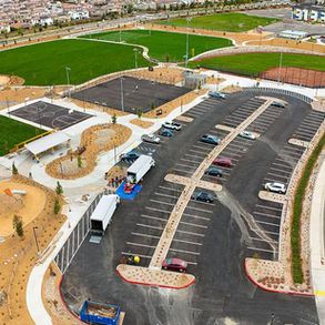 The 11.8-acre site features lighted youth baseball and soccer fields, lighted basketball, volleyball, and tennis courts, play structures and a zipline, a dog park, a group picnic pavilion, restrooms, and parking. An extensive central open space area was graded to provide bio-retention with meandering walkways and passive seating.